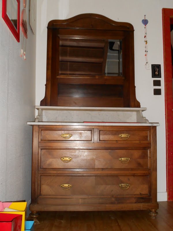 On a fait venir le menuisier pour le nouveau meuble. Alors il est en noyer et un peu abîmé parce qu'il a pris l'eau (les anciens propriétaires on fait refaire leur toiture, l’entreprise n'a pas mis de bâche et il a plut ...). Alors peut être qu'avec un peu de cire on peut reprendre un peu le truc.